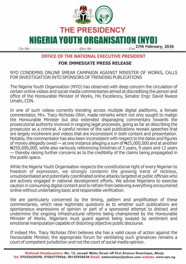 According to the group, “While the Nigeria Youth Organisation respects the constitutional right of every Nigerian to freedom of expression, we strongly condemn the growing trend of reckless, unsubstantiated and potentially coordinated online attacks targeted at public officials who are actively engaged in national development efforts. We advise Nigerians to exercise caution in consuming digital content and to refrain from believing everything encountered online without undertaking basic and responsible verification.