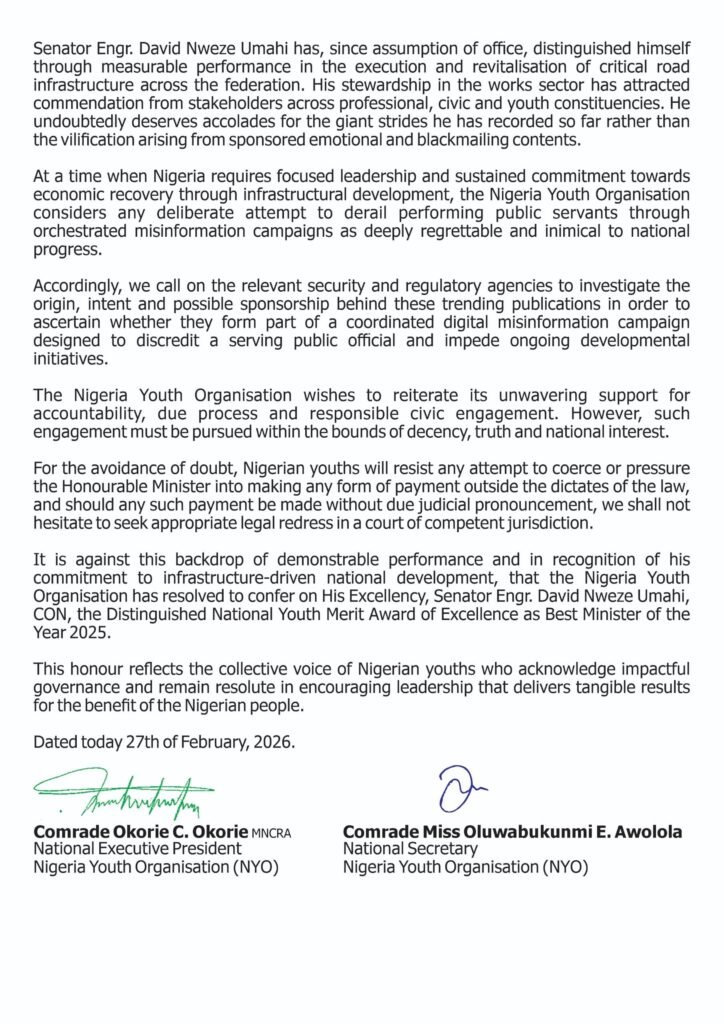 The Nigerian Youth Organisation (NYO) has announced its plans to confer “the Distinguished National Youth Merit Award of Excellence as Best Minister of the Year 2025” on the Minister of Works, Engr. David Umahi “in recognition of his commitment to infrastructure-driven national development.”